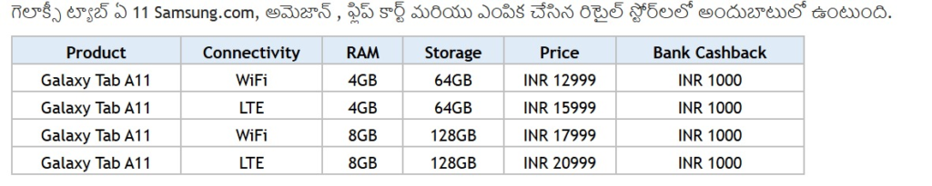 మెమరీ & స్టోరేజ్: గెలాక్సీ ట్యాబ్ A11 గరిష్టంగా 8జీబీ మెమరీని అందిస్తుంది, ఇది వేగవంతమైన మల్టీ-టాస్కింగ్కు తోడ్పడుతుంది. అలాగే, 128జీబీ అంతర్గత స్టోరేజ్తో వస్తుంది.